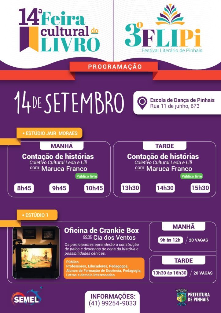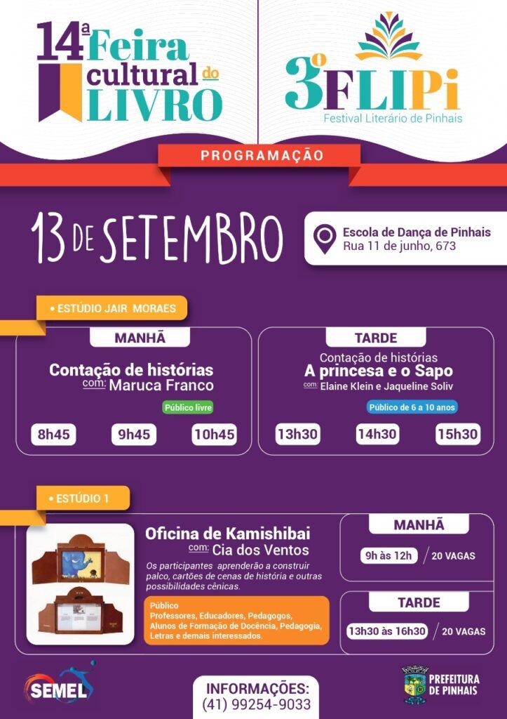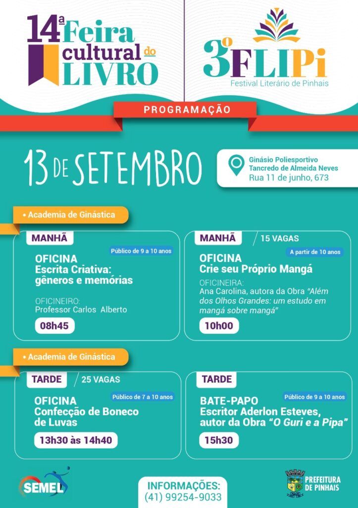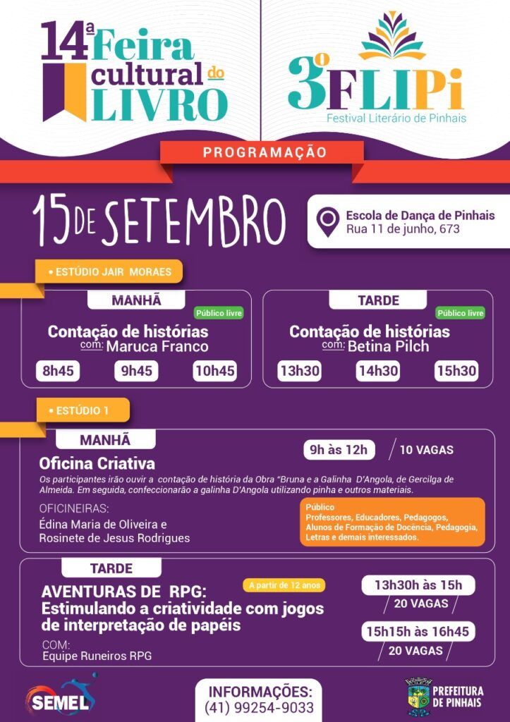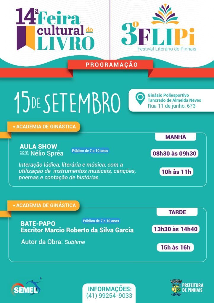 Realizado pela Secretaria de Cultura, Esporte e Lazer (Semel), após 2 anos sem atividades, por conta da pandemia do COVID-19, a Feira Cultural e o Festival Literário voltam a ser promovidos no município nos dias 12 a 16 de setembro. Organizados pelo Departamento de Cultura e Biblioteca Pública de Pinhais, os eventos tem programação repleta de atrações para todas as idades. (Confira no fim da matéria a programação completa)
