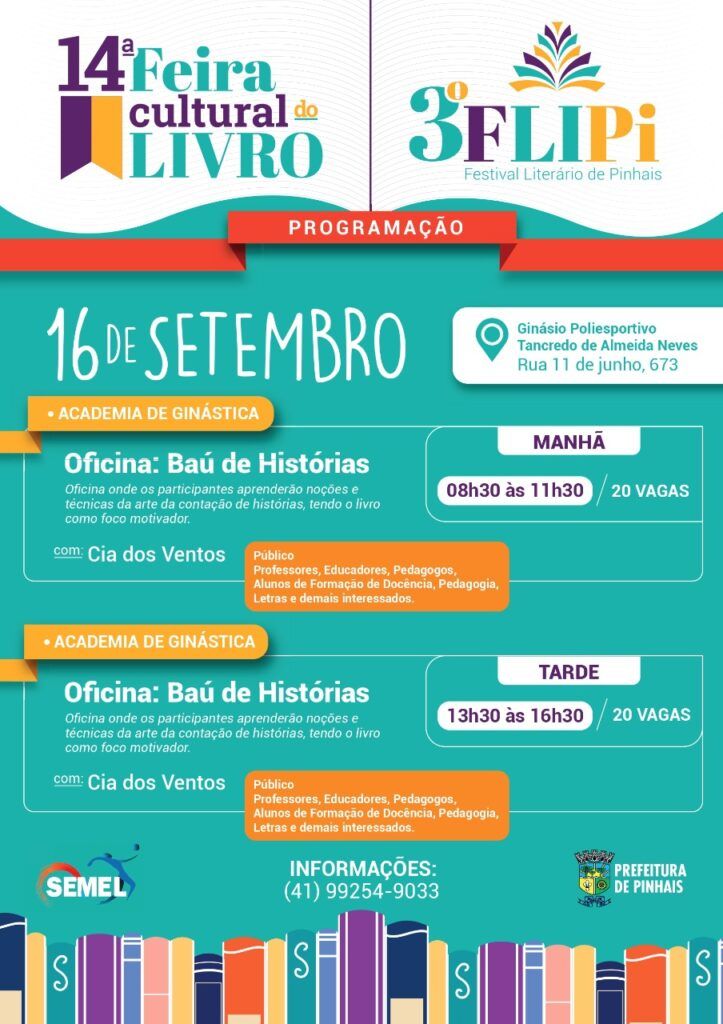 No dia 12, às 19h30, acontece a abertura dos eventos com o espetáculo “Eba a extraordinária Biblioteca de Alexandria”, no Auditório Márcio José Moro, no Centro Cultural Wanda dos Santos Mallmann, com classificação livre. Ao longo da semana as atividades acontecem durante toda a manhã e tarde, na Escola de Dança de Pinhais e no Ginásio Poliesportivo Tancredo de Almeida Neves, conforme a programação, com contações de histórias, bate-papos com diversos escritores, espetáculos e oficinas para jovens e adultos, além de aventuras de RPG.