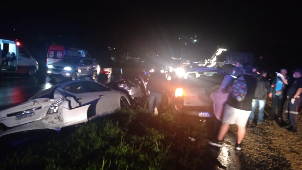 “Foi quando um bitrem tracionado por uma Scania, de Cascavel, que transitava pela faixa da direita, não foi capaz de frear e assim realizou manobra de mudança de faixa, tendo então batido lateralmente com dois caminhões, o que provocou o derramamento de carga sobre a pista (soja). Em seguida, bateu com uma série de automóveis, que acabaram sendo projetados para o canteiro central, até que acertou transversalmente um Chevrolet Ônix, de Ponta Grossa, tendo então parado sobre a faixa da esquerda”, informou a PRF.