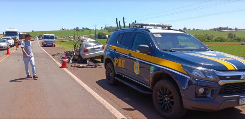 Segundo a Polícia Rodoviária Federal (PRF), a batida aconteceu no km 446 e o carro ficou completamente destruído.