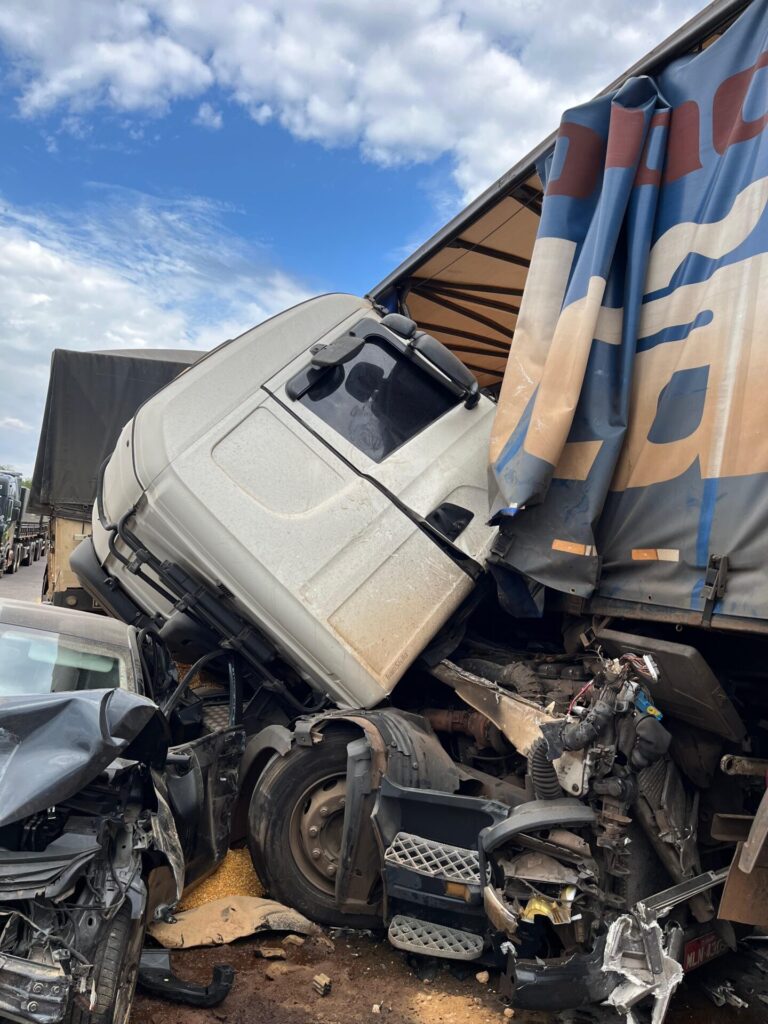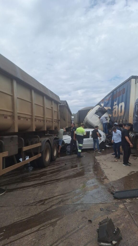 Um acidente envolvendo cinco carretas e dois carros de passeio foi registrado na tarde desta terça-feira (7), no quilômetro 161 da BR-163. A colisão em sequência resultou na morte do motorista de uma das carretas e deixou outras sete pessoas feridas, cinco delas com lesões leves, segundo informações preliminares.
