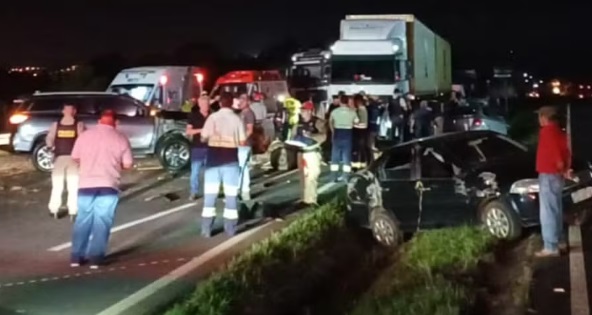Os levantamentos iniciais apontam que o caminhão conduzido pela vítima fatal trafegava em velocidade incompatível com as condições da via. Marcas de frenagem encontradas no asfalto indicam que o motorista tentou parar, mas não conseguiu evitar a colisão, provocando o engavetamento entre os veículos.