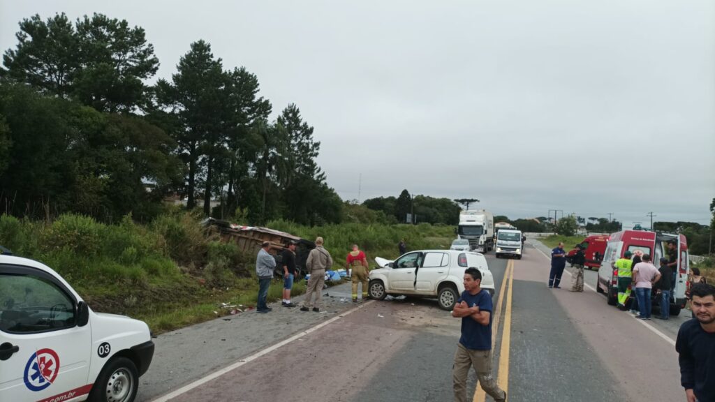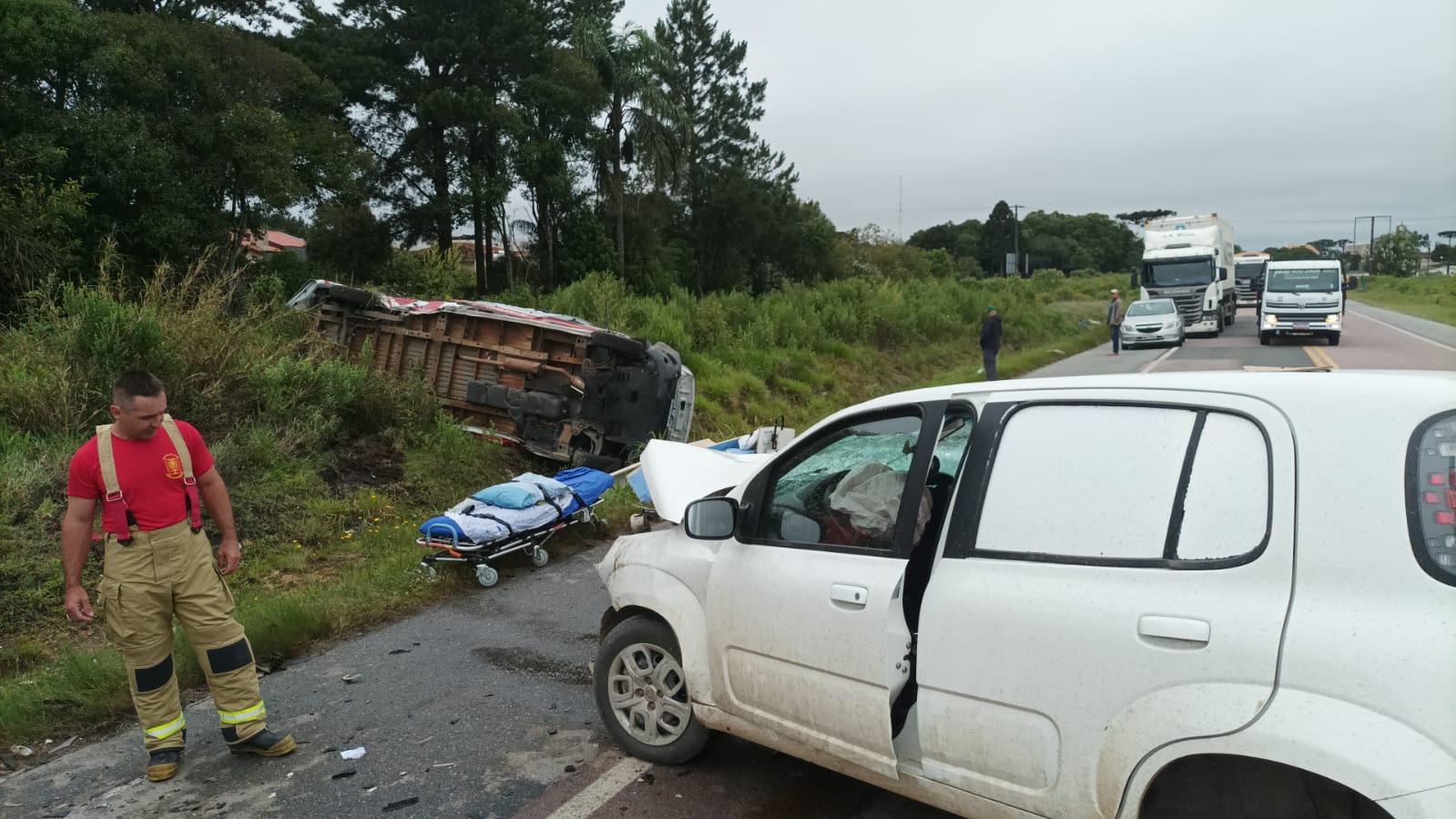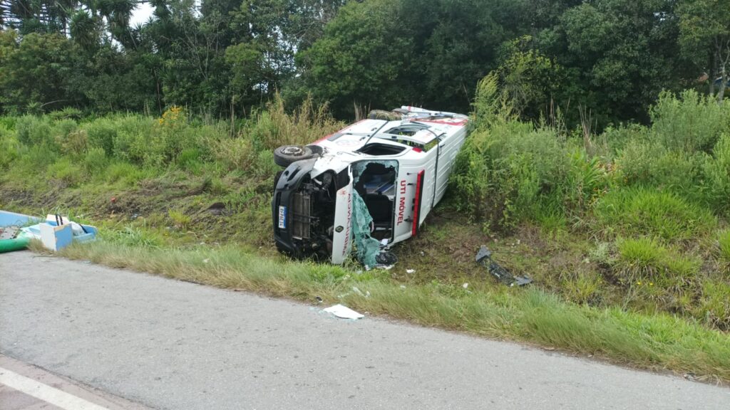 O acidente aconteceu pouco depois das 7 horas, no quilômetro 185, na região do Mariental. Ao Portal Nosso Dia, o cabo Volochen, do Corpo de Bombeiros, disse que o acidente foi provocado por uma tentativa de desvio. “Um Gol tentou desviar de uma moto que estava acessando a rodovia e bateu na lateral da ambulância. Essa ambulância perdeu o controle, cruzou a pista contrária e deu de frente com outro carro, um Fiat Uno, e capotou. Cinco pessoas ficaram feridas”, disse ele. O motociclista, segundo testemunhas, não parou no local.