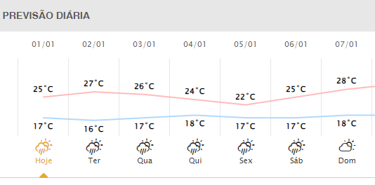 Na terça-feira (2), a máxima chega a 27°C com mínima de 16°C. Na quarta (3), a temperatura chega a 26°C e quinta (4) a previsão é de 24°C, ambos dias com pouca variação da mínima.