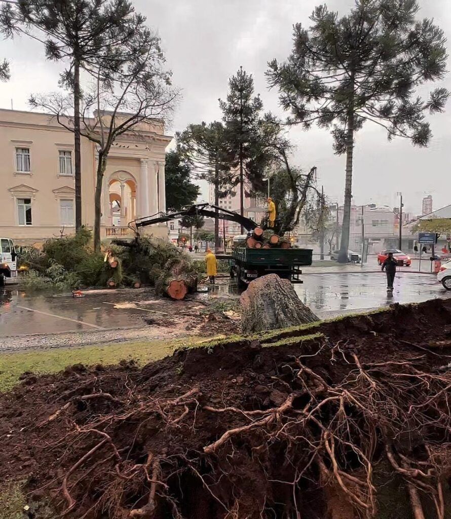Uma árvore centenária ao lado da Câmara Municipal de Curitiba (CMC) despencou na manhã desta quinta-feira (1º) durante as chuvas. Ninguém se machucou. Máquinas fizeram o corte e o recolhimento de parte delas logo após a queda. (assista ao vídeo).