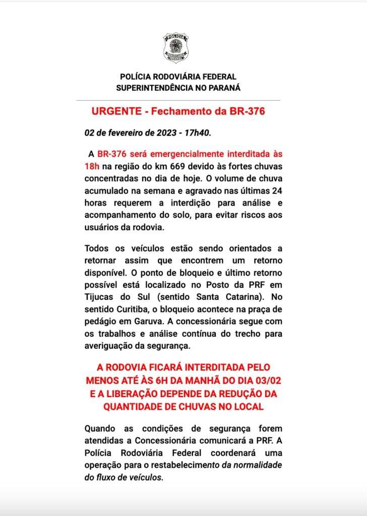 A BR-376 foi interditada totalmente para trânsito às 18h desta quinta-feira (2) em uma medida de segurança tomada por parte da Polícia Rodoviária Federal (PRF). Segundo a corporação, a decisão, no trecho da Serra do Mar, em Guaratuba (km 669), se dá pelo alto acumulado de chuva das últimas 24 horas.