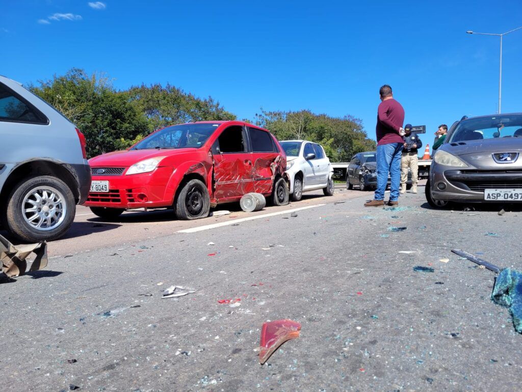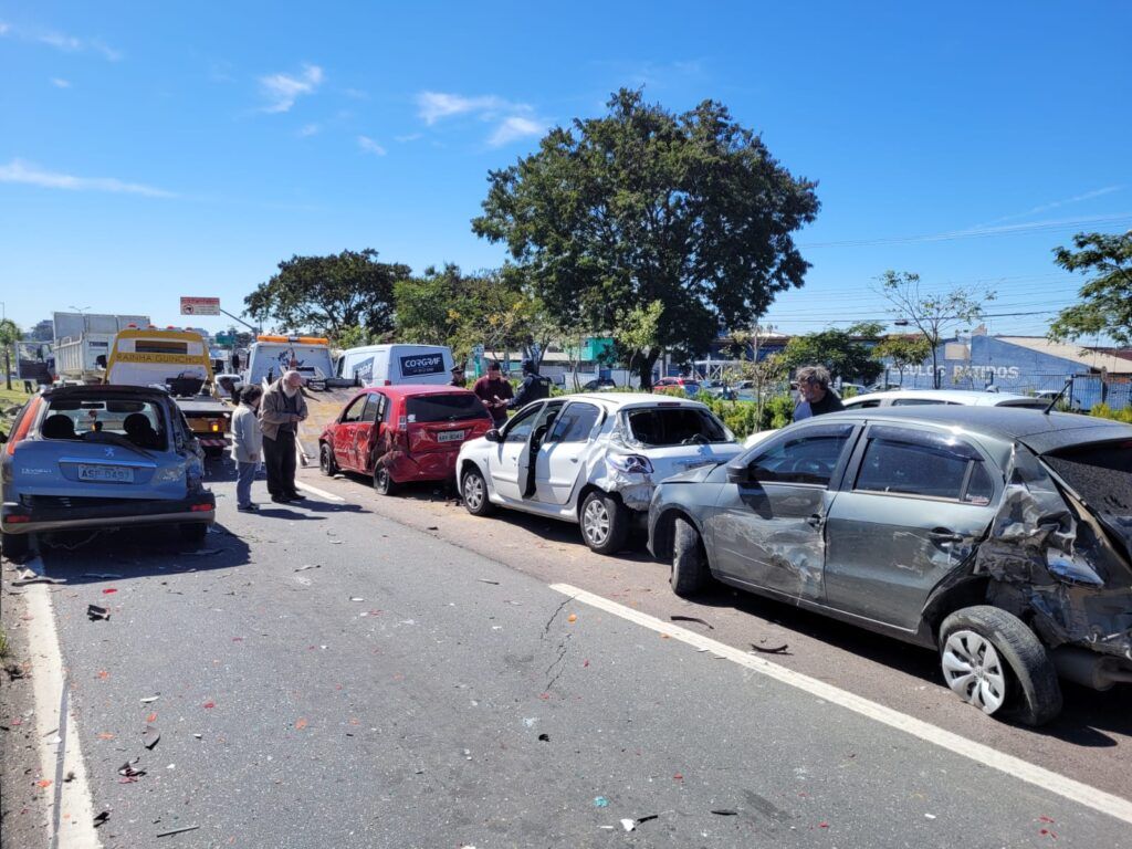 Conforme o Corpo de Bombeiros, os carros estavam parados no sinaleiro vermelho quando o caminhão, sem freio, causou a sequência de colisões.