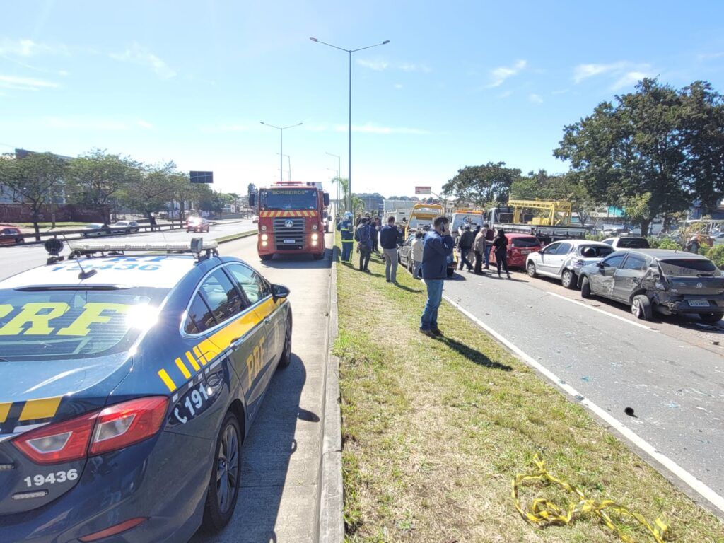 Um caminhão ficou sem freio e causou um engavetamento com outros nove veículos, a maioria carros, na manhã desta sexta-feira (19), no bairro Xaxim, em Curitiba. O acidente aconteceu próximo à estação-tubo São Pedro, na pista sentido São Paulo, e deixou três pessoas feridas.