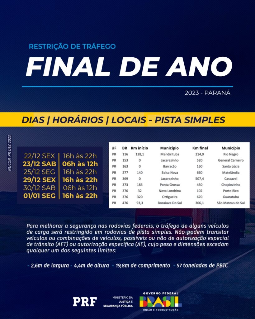 A Polícia Rodoviária Federal (PRF) inicia à 00h00 desta sexta-feira (22) a Operação Natal 2023 para garantir a segurança nas vias federais paranaenses durante o feriado. Até as 23h59min da próxima segunda-feira (25), o trabalho da PRF será reforçado com policiais que vão intensificar a fiscalização e as atividades preventivas nas rodovias federais. Neste ano, haverá restrição para o tráfego de determinados caminhões em estradas de pista simples.