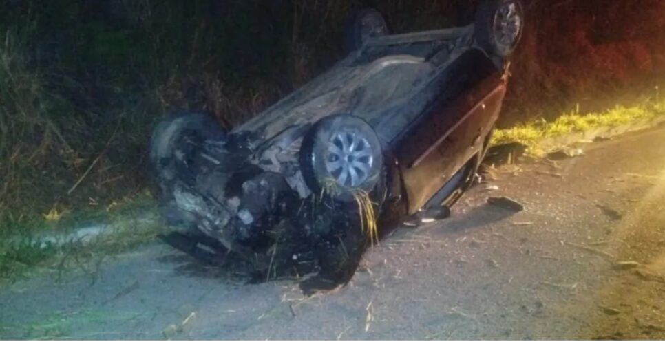 Ainda conforme a PRF, não houve vítima no acidente, mas o veículo permanece tombado sobre a faixa da direita, até que seja possível transbordar totalmente a carga de metal.