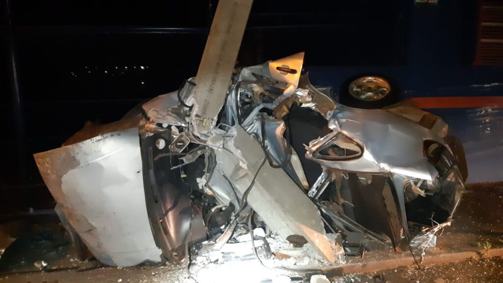 Devido ao acidente, o carro VW Polo ficou completamente destruído e o motorista, de 32 anos, morreu na hora.