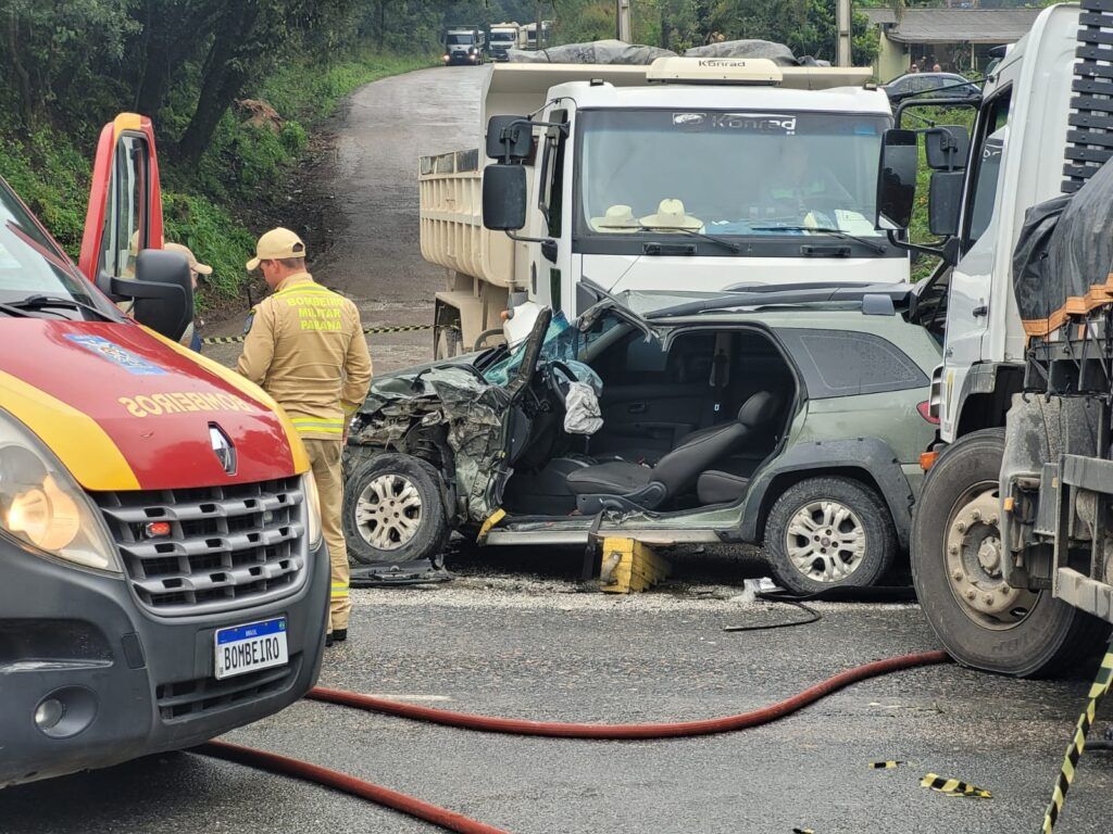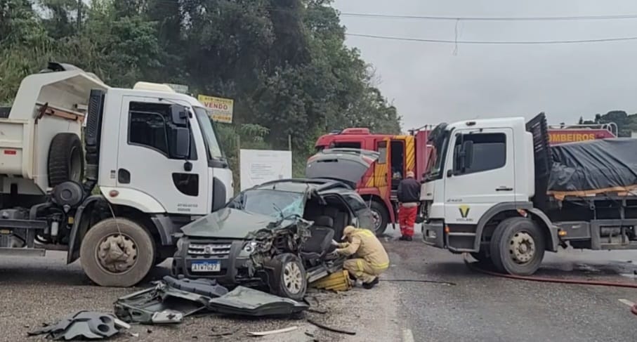 Um acidente entre um carro e dois caminhões deixou um motorista de 53 anos em estado grave, em Almirante Tamandaré, na Região Metropolitana de Curitiba, no fim da manhã desta quarta-feira (17).