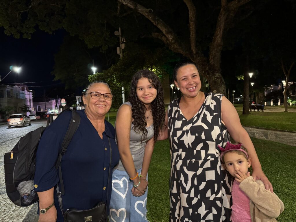 Ela aproveitou a noite de calor para trazer as filhas e a mãe Cleide, que veio do Rio para curtir o Natal na cidade. “Curitiba é uma cidade maravilhosa, está lindo, o espetáculo é lindo. Cada detalhe de cada espetáculo. Os parques, em outros lugares, aqui nas ruínas, está maravilhoso, dá para aproveitar bem com a família”, disse a professora.