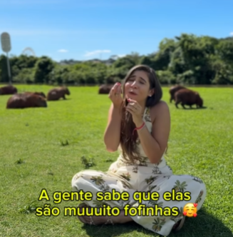 “A gente sabe que elas são muuuuito fofinhas, mas você sabia que é sugerido ficar a dois metros de distância delas? Mesmo com vontade de fazer carinho, é bom lembrar que as capivaras são animais silvestres. Elas podem transmitir doenças e ter comportamentos imprevisíveis.”