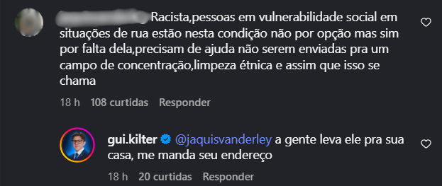“Racista,pessoas em vulnerabilidade social em situações de rua estão nesta condição não por opção mas sim por falta dela,precisam de ajuda não serem enviadas pra um campo de concentração,limpeza étnica e assim que isso se chama”