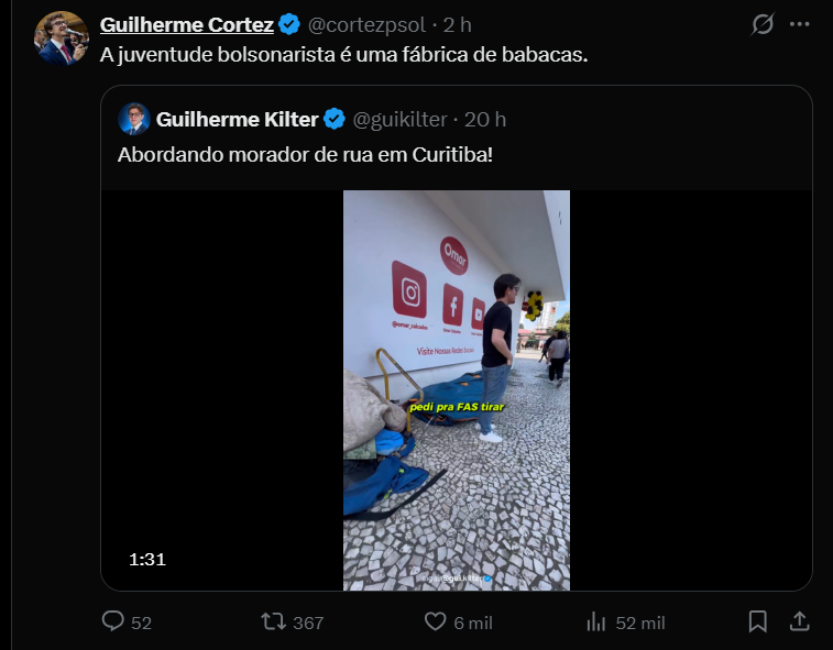 Já no X (antigo Twitter) os usuários em sua maioria criticam a atitude na própria publicação. O deputado estadual de São Paulo Guilherme Cortez (PSOL) foi uma dessas pessoas, ao retweetar o vídeo ele escreveu: “A juventude bolsonarista é uma fábrica de babacas.”
