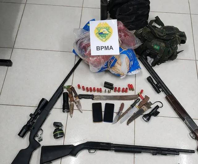 Ao se aproximarem, os agentes perceberam movimentação suspeita e realizaram a abordagem. Os suspeitos, que utilizavam roupas camufladas, estavam armados com um fuzil calibre .762 e duas espingardas calibre 12, além de munições, facas, lanternas e mochilas.