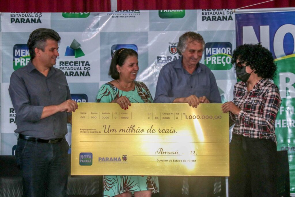 Foi entrega nesta quinta-feira (10) o prêmio máximo do programa Nota Paraná. A ganhadora, empresária de Sarandi, Noroeste do Estado, levou R$ 1 milhão no sorteio de outubro do programa. A premiação foi realizada na Prefeitura. Detalhe que ela foi disfarçada receber o prêmio e o nome dela não divulgado, o que é comum acontecer.