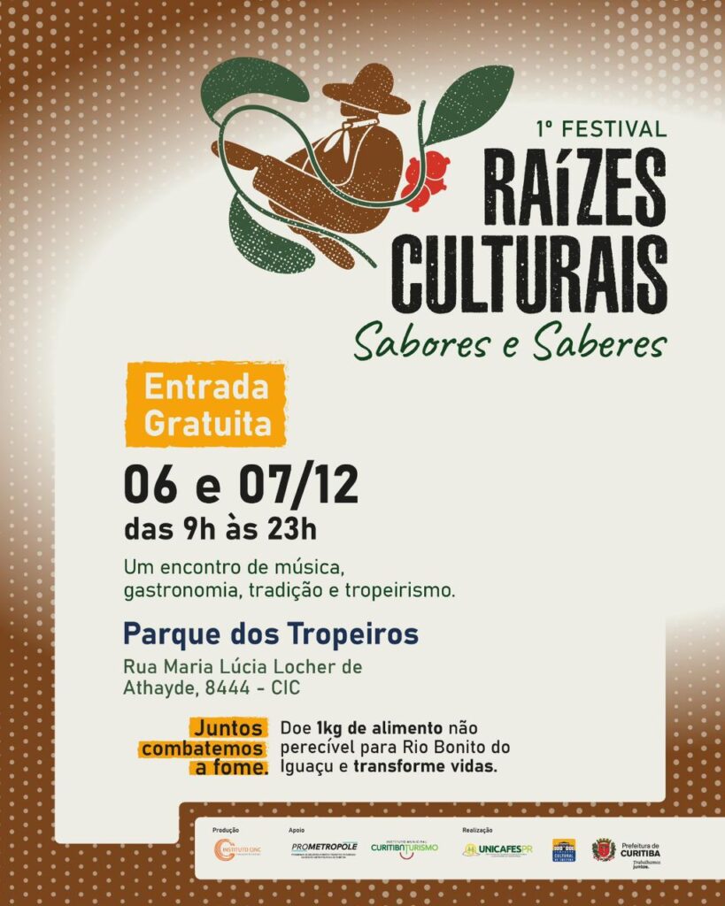 O Parque dos Tropeiros, na Cidade Industrial de Curitiba (CIC), receberá a primeira edição do Festival Raízes Culturais – Sabores e Saberes, reunindo música regional, gastronomia típica, danças tradicionalistas e manifestações ligadas ao tropeirismo. A entrada é gratuita, e o evento será realizado nos dias 6 e 7 de dezembro, sábado e domingo, das 9h às 23h, na Rua Maria Lúcia Locher de Athayde, 8444, CIC.