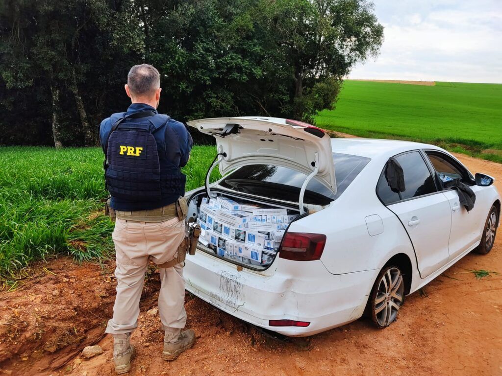 No veículo foram encontrados aproximadamente 19.500 maços de cigarro de origem estrangeira. O veículo e os cigarros foram entregues na Receita Federal de Ponta Grossa.