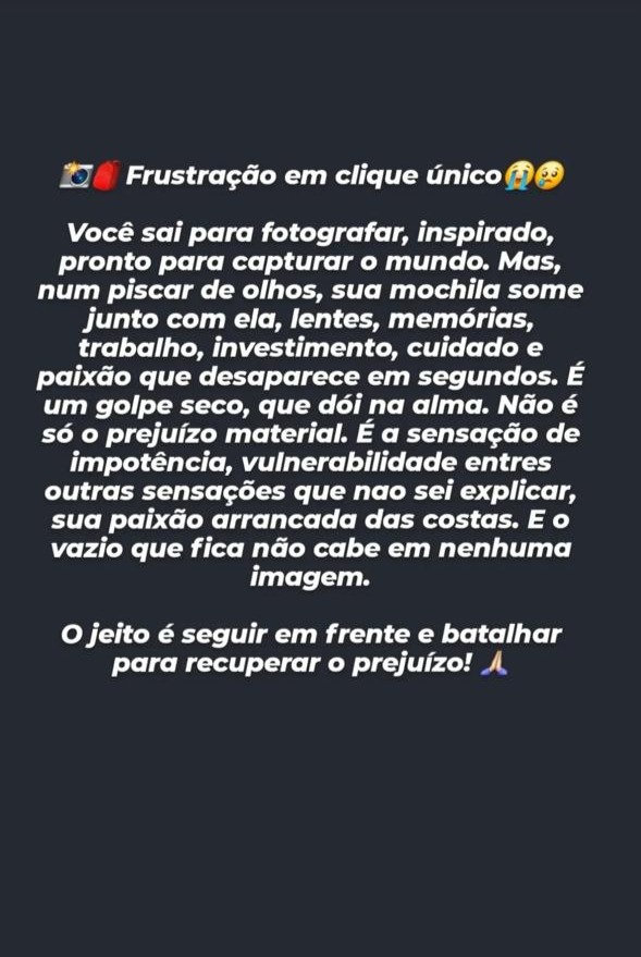 Como uma forma de alertar para a situação, o fotógrafo compartilhou o caso em suas redes sociais, e expressou frustração com o acontecido. “Em um piscar de olhos sua mochila some, e junto com ela lentes, memórias, trabalho, investimento, cuidado e paixão que vão embora em segundos”, escreveu.