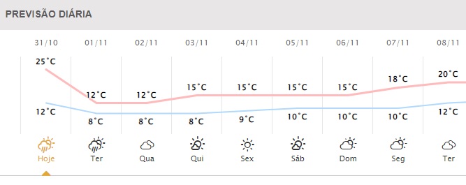 O frio será tão intenso, o que não é comum para o mês de novembro, que a máxima prevista na terça para Curitiba será de apenas 12°C, com mínima de 8°C. Em algumas regiões do Paraná, não se descarta a ocorrência de geada fraca.