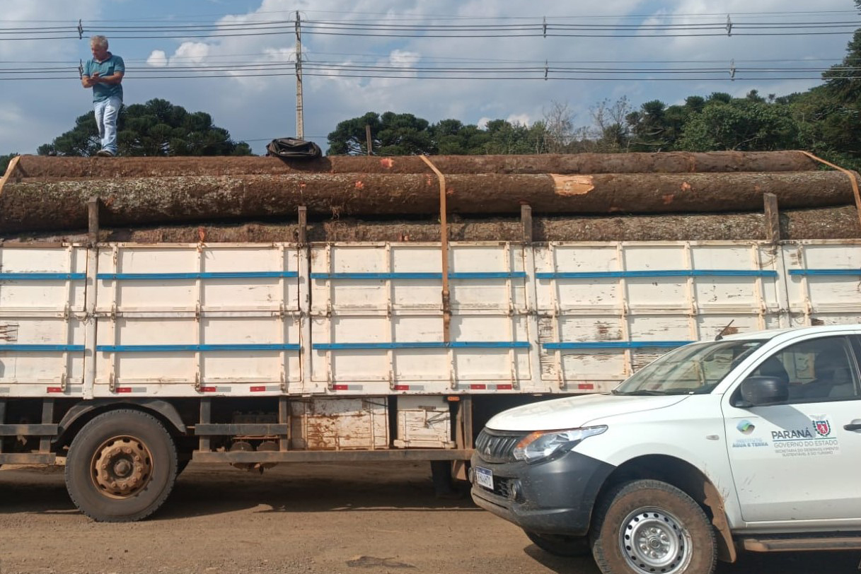 O escritório regional do Instituto Água e Terra (IAT) de Guarapuava, na região Central, divulgou nesta quinta-feira (19) o resultado de mais uma ação contra o desmatamento ilegal no Paraná. Fiscais do órgão ambiental apreenderam um caminhão que transportava sem autorização 24 toras de araucária em uma estrada rural na localidade de Zattarlândia, no município de Pinhão, no Centro-Sul. A carga equivale a 40 metros cúbicos de madeira.