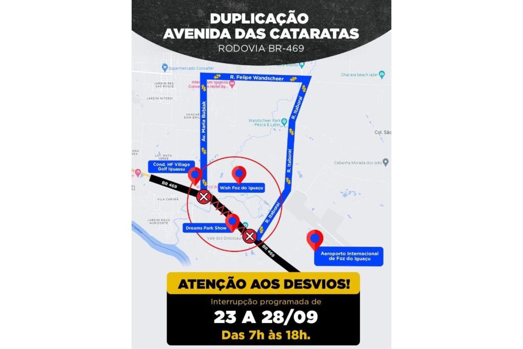 O Departamento de Estradas de Rodagem do Paraná (DER/PR) informa que fará a interdição total do tráfego da BR-469 em Foz do Iguaçu, a partir de segunda-feira (23) de manhã, até o final da tarde de sábado (28). A interdição será no trecho de cerca de 1,8 quilômetros entre a Avenida Maria Bubiak e a Rua Itaboraí, sendo necessário para realizar operação de transporte e lançamento de vigas pré-moldadas de concreto da nova ponte sobre o Tamanduá e no viaduto do km 3+970, em frente ao Dreamland Museu de Cera. A interdição começará diariamente às 7h e segue até as 18h.