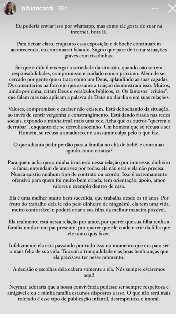 A irmã de Bruna Biancardi, cunhada de Neymar Jr, publicou um ‘textão’, nesta sexta-feira, 30. Bianca Biancardi fez críticas, nas redes sociais, ao comportamento de Neymar Jr, pai da filha que a irmã espera. Após admitir traição e pedir perdão à Bruna, o jogador partiu para o deboche ao ser exposto flertando com outras mulheres, dias depois.
