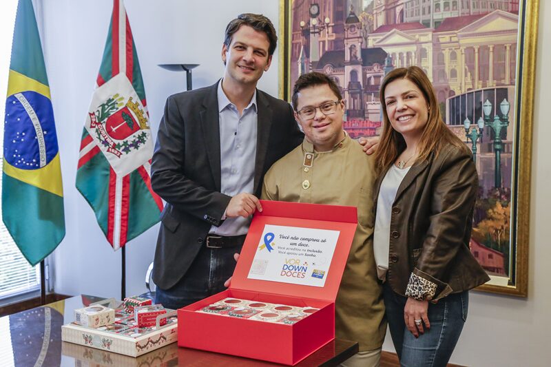 O prefeito Eduardo Pimentel, acompanhado da primeira-dama, Paula Mocellin, recebeu na tarde desta quarta-feira (17/12), em seu gabinete, o jovem empreendedor Olavo de Araújo Costa Junior, o Junior, fundador da Vor Down Doces. Aos 30 anos, Junior, que tem síndrome de Down, é exemplo de empreendedorismo inclusivo: além de produzir brigadeiros gourmet, ele faz pessoalmente as entregas, fazendo do seu trabalho uma importante mensagem de autonomia, superação e valorização da diversidade.