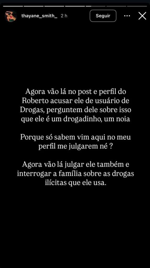 A jovem Thayane Smith voltou a se manifestar nas redes sociais sobre o caso envolvendo Roberto Farias, conhecido como “Betinho”, ao publicar uma série de textos seus stories com acusações de que o rapaz seria usuário de drogas ilícitas.