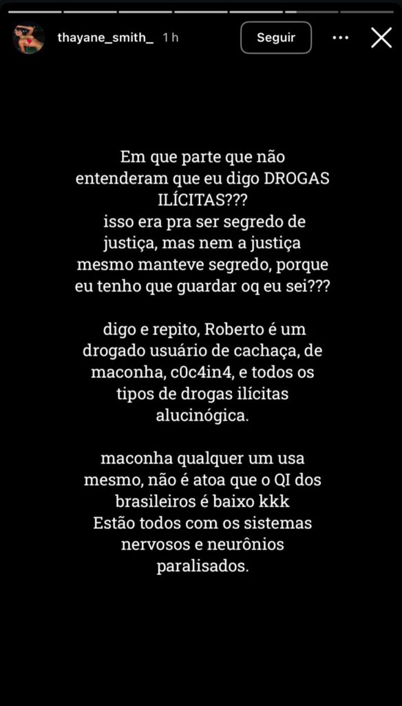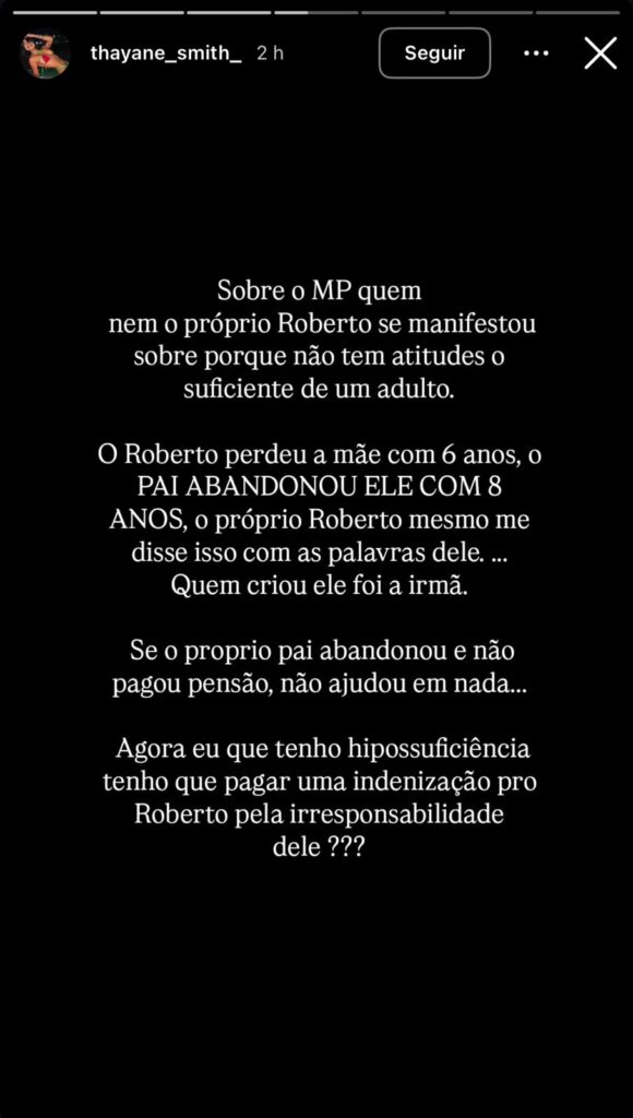 Ela também comenta que Roberto não teria se manifestado publicamente por, segundo ela, não apresentar atitudes compatíveis com as de um adulto. “Ele não tem atitudes, não tem atitudes suficientes de um adulto”, afirmou nos stories.
