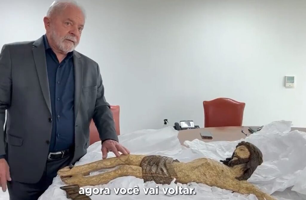 Ao lado da primeira-dama Rosângela da Silva, a Janja, e do ministro da Secretaria de Relações Institucionais, Alexandre Padilha, Lula desembrulhou a imagem sobre a mesa e ficou emocionado. “Você vai voltar”, afirmou o presidente, que é católico, olhando para o Cristo crucificado. “Eu já voltei, agora você vai voltar. E, juntos, nós vamos mudar esse País”, disse.