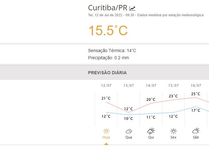 Em 12 de junho, por exemplo, Curitiba amanheceu com temperatura na faixa dos 2°C, o que não se repetiu mais. Por enquanto, em um horizonte de 15 dias, ainda não há uma previsão de uma queda brusca na temperatura. Mas, como em previsão do tempo a estimativa mais precisa é de cinco dias, tudo pode acontecer.