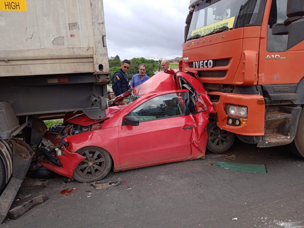 Segundo a Polícia Rodoviária Federal (PRF), um Gol com placas de Curitiba ficou pensado entre dois caminhões, na altura do KM488.