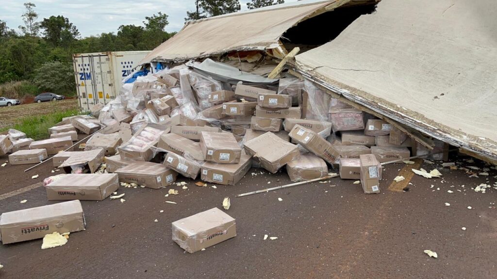 Com o impacto, a carga de carne transportada pela carreta se espalhou pelo asfalto, bloqueando parte da rodovia e exigindo atenção redobrada dos motoristas que passavam pelo trecho.