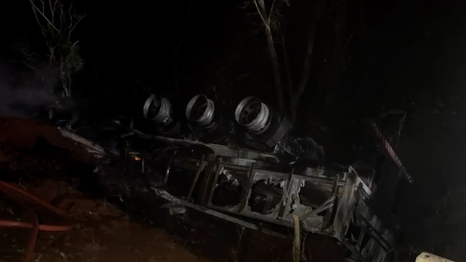 Com a força do impacto, a carreta saiu da pista, tombou e parou com as rodas para cima. Depois, o veículo pegou fogo sem que houvesse tempo para que o homem preso às ferragens pudesse ser salvo. A carreta ficou destruída devido à ação das chamas.