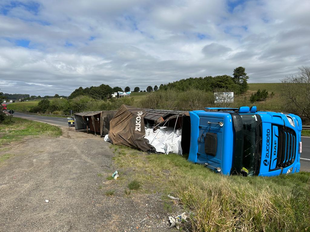 Conforme a PRF, o motorista seguia sentido Ponta Grossa, quando perdeu o controle da direção e tombou, derramando parte da carga sobre a pista e acertando as defensas metálicas da rodovia.
