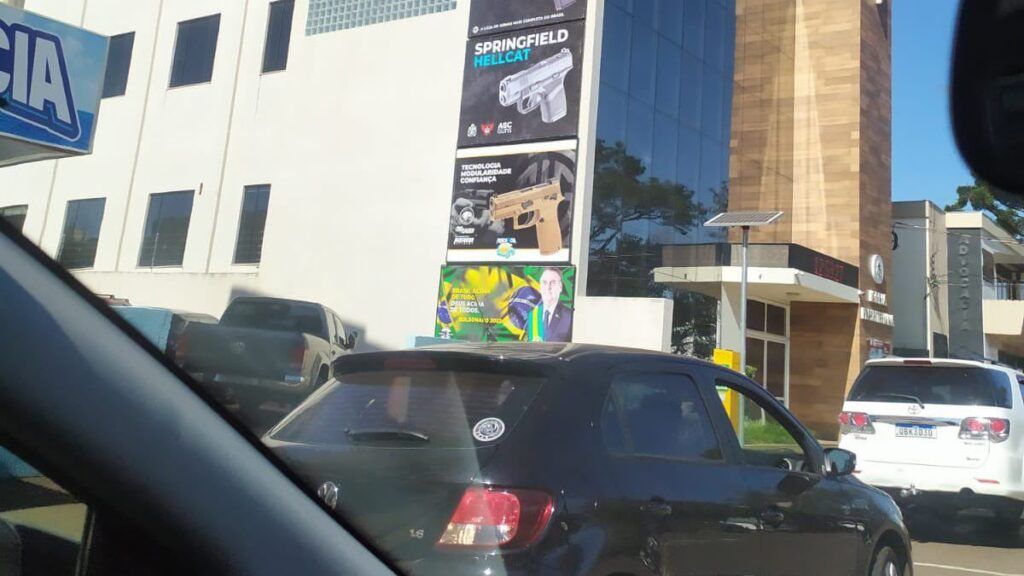 O anúncio foi compartilhado por internautas nas redes sociais e ainda está no local. A igreja fica na região central de Cascavel, município de aproximadamente 330 mil habitantes no oeste do Paraná. A propaganda exibe três pistolas vendidas pela loja, que fica ao lado da igreja. Quem passa pela rua vê a publicidade e, na sequência, a fachada do templo com uma cruz. O muro divide os dois terrenos. Além das armas, o outdoor traz uma foto de Bolsonaro com a frase “Brasil acima de tudo, Deus acima de todos”, slogan usado pelo presidente para atrair o público cristão já em 2018.