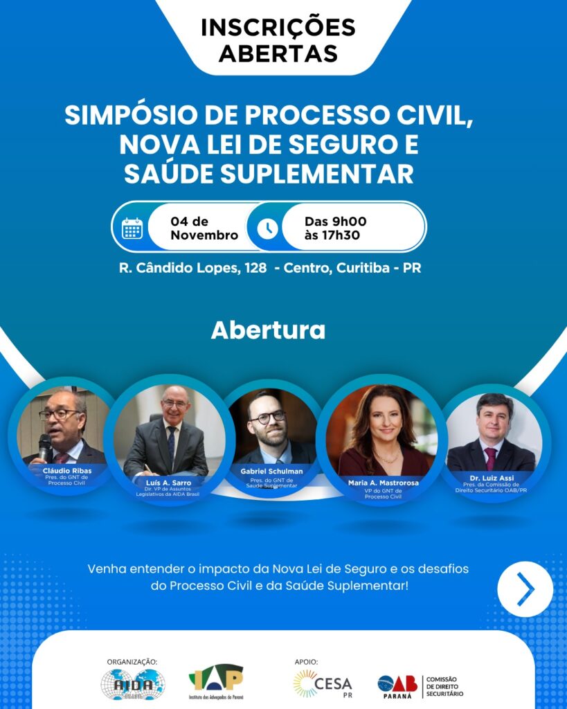 A nova Lei de Seguros, sancionada em dezembro de 2024 e com vigência prevista para 11 de dezembro de 2025, será tema central do Simpósio de Processo Civil, Nova Lei de Seguro e Saúde Suplementar, que acontece no dia 4 de novembro, em Curitiba, na Rua Cândido Lopes, 128, no Centro, das 9h às 17h30.