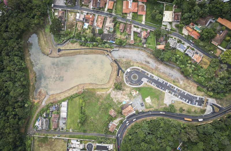 Localizada na Rua Eduardo Sprada, no trecho entre a Maria Bizinelli e a José Baggio, a bacia de detenção foi implantada às margens do Rio Mossunguê. O curso d’água é afluente do Rio Barigui, principal eixo hídrico de Curitiba, que nasce em Almirante Tamandaré e deságua em Araucária, atravessando a cidade no sentido norte-sul e formando a maior bacia hidrográfica do município. Em dias de chuvas fortes, o transbordamento do rio afeta diferentes áreas, como o Jardim Santos Andrade, agora mais protegido da ação climática.
