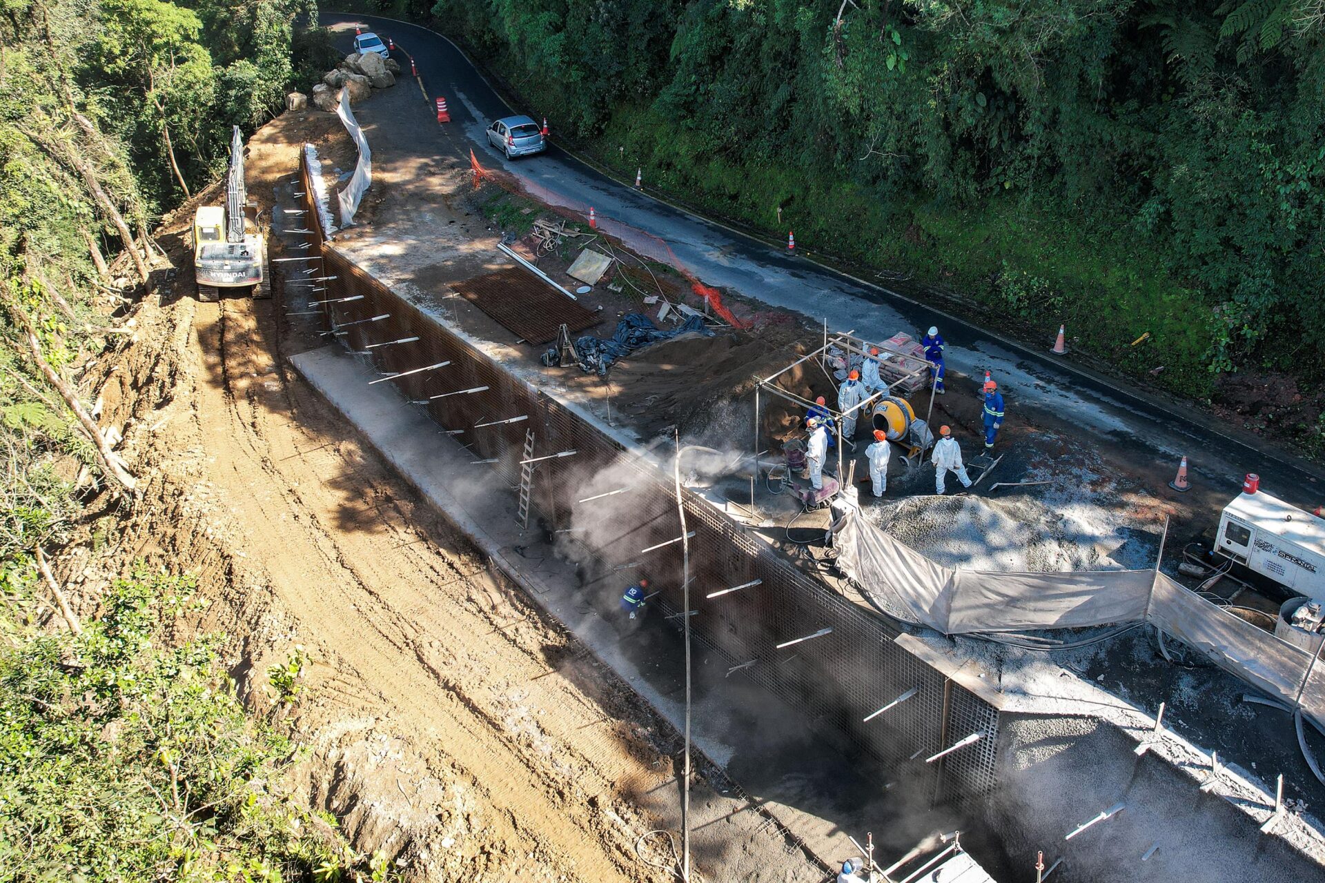 E no km 7, onde os danos abaixo da pista chegaram a provocar rachadura no pavimento, está em execução o novo muro de contenção, com telas metálicas e concreto projetado, com o local para ser entregue no meio de setembro.