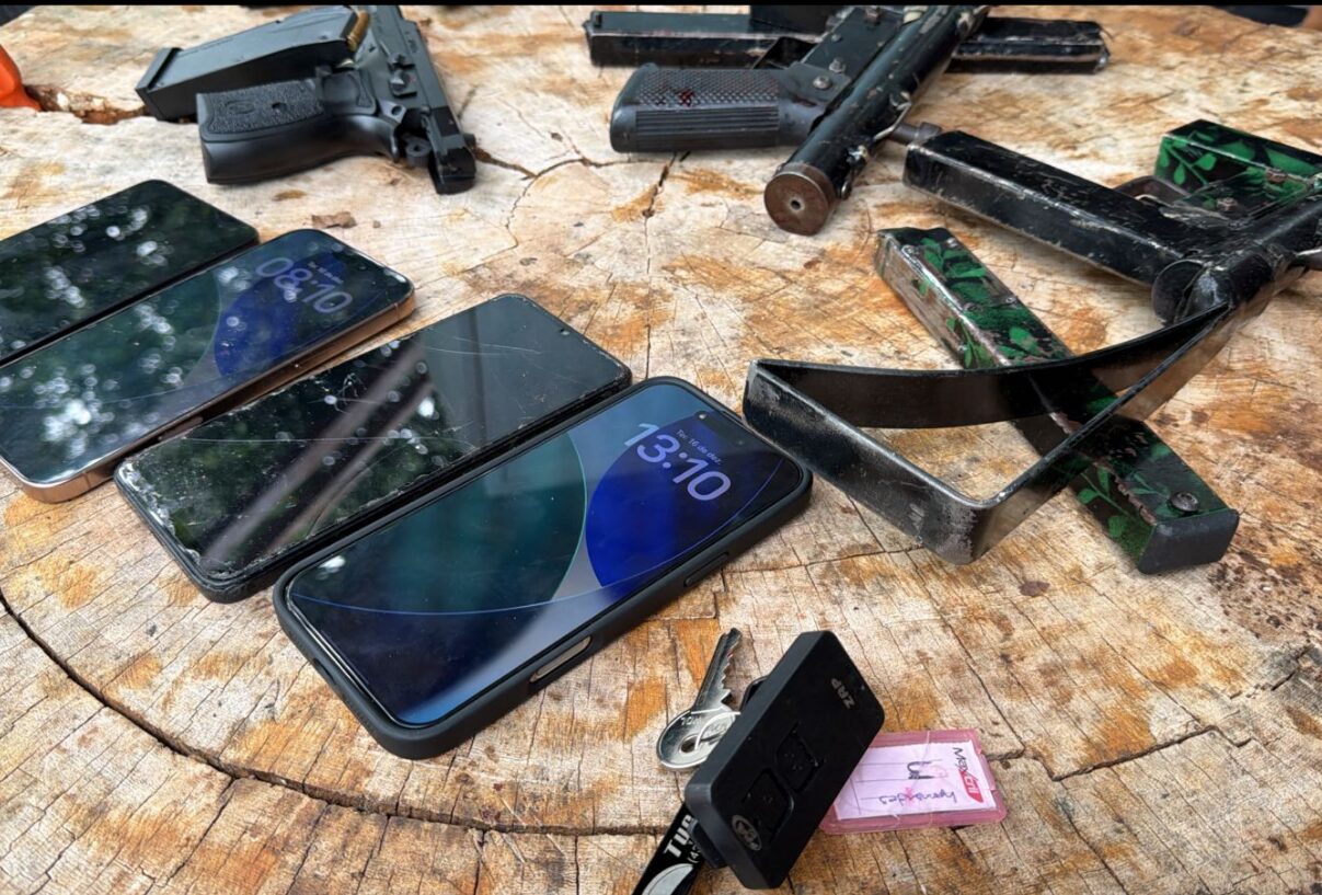 Nos três mandados de busca e apreensão cumpridos foram apreendidos uma pistola Glock calibe 45 com kit rajada, dois carregadores nove milímetros alongados, dois kits para transformar pistola em submetralhadora com mira eletrônica, 49 munições nove milímetros, uma caminhonete, uma motocicleta, oito celulares, duas canetas e R$ 7,2 mil.