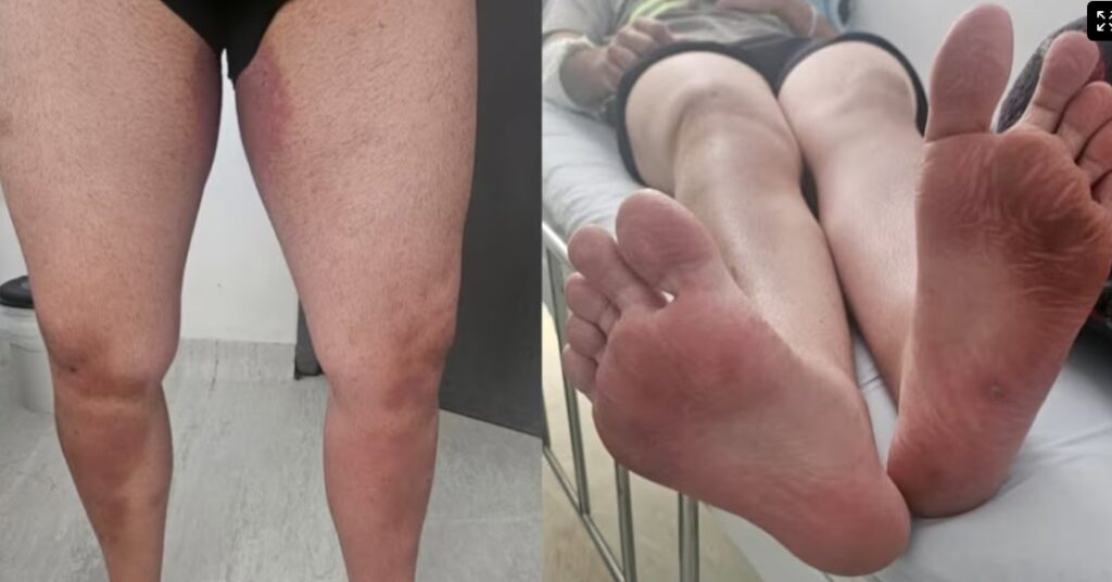 “Resultado da jornada”, escreveu Renata Farias na publicação. Nas imagens, é possível ver que Tomaz tem lesões nas mãos, nos pés e nas pernas.