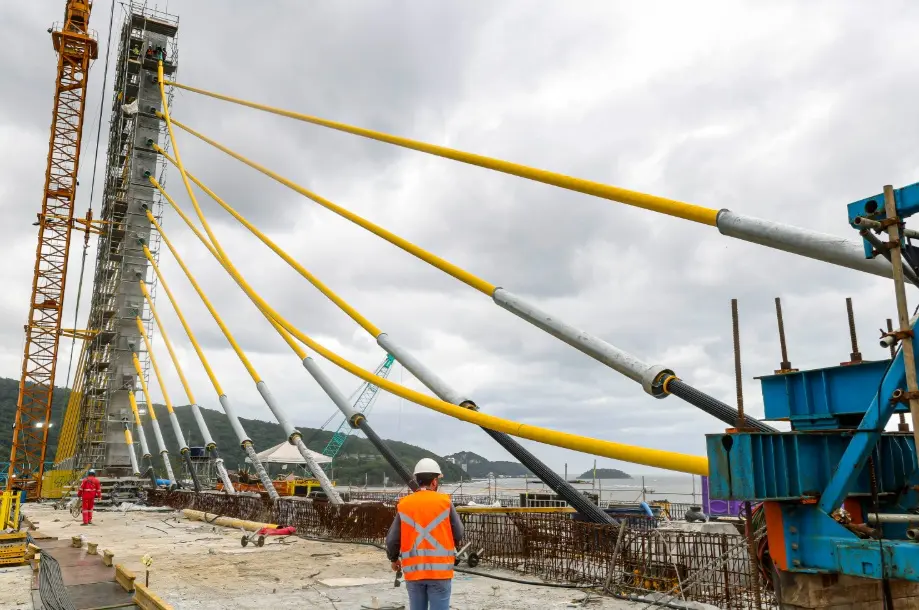 Foram fixados 12 pares de estais em cada um dos mastros dos apoios 04 e 05, garantindo a estabilidade da parte central da estrutura. O último estai foi instalado no apoio 04. As torres de sustentação têm 40 metros de altura, superando a altura do Cristo Redentor, no Rio de Janeiro.