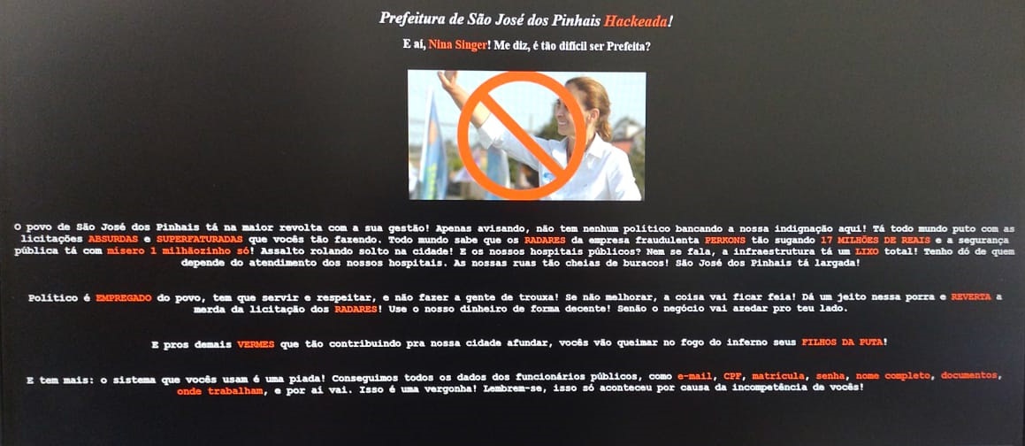 “A Prefeitura de São José dos Pinhais informa que nesta quinta-feira (4), aproximadamente às 9h20, a versão web do Sistema Administrativo da Prefeitura de São José dos Pinhais sofreu um ataque cibernético do tipo defacement (ato de desfigurar a aparência de uma tela com o objetivo de transmitir uma mensagem de cunho ativista).