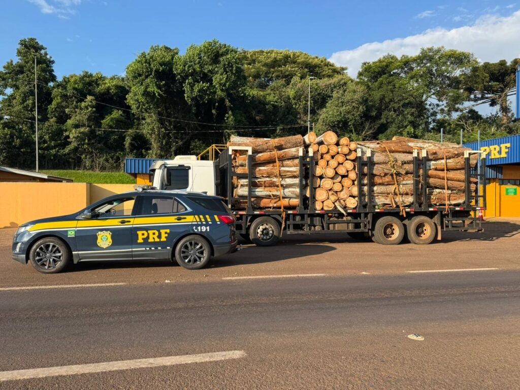 Um caminhão carregado com toras de eucalipto foi flagrado pela Polícia Rodoviária Federal (PRF) transportando 15 toneladas de excesso de peso na BR-277, durante uma fiscalização de rotina realizada nas proximidades de um posto da corporação.