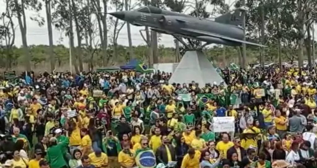 Parte da área está ocupada por barracas e lonas de circo, cenário que se repete pelo Brasil. Há palavras de ordem como “Forças Armadas, salvem o Brasil” e “se for preciso a gente acampa, porque o ladrão não sobe a rampa”, em referência ao Palácio do Planalto.