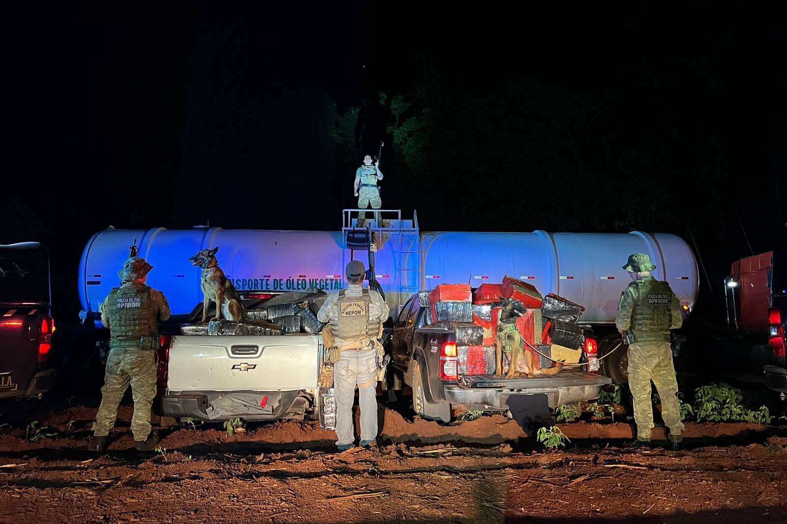 Com auxílio dos cães, os policiais conseguiram prender quatro pessoas e apreender mais de 2,5 toneladas de droga (substância análoga à maconha), além de duas caminhonetes e a carreta-tanque.