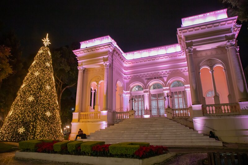 Uma árvore de Natal de 12 metros adorna o jardim e a fachada do edifício histórico que sedia o Legislativo Municipal. Além disso, a construção ganha uma iluminação toda especial até o dia 6 de janeiro.